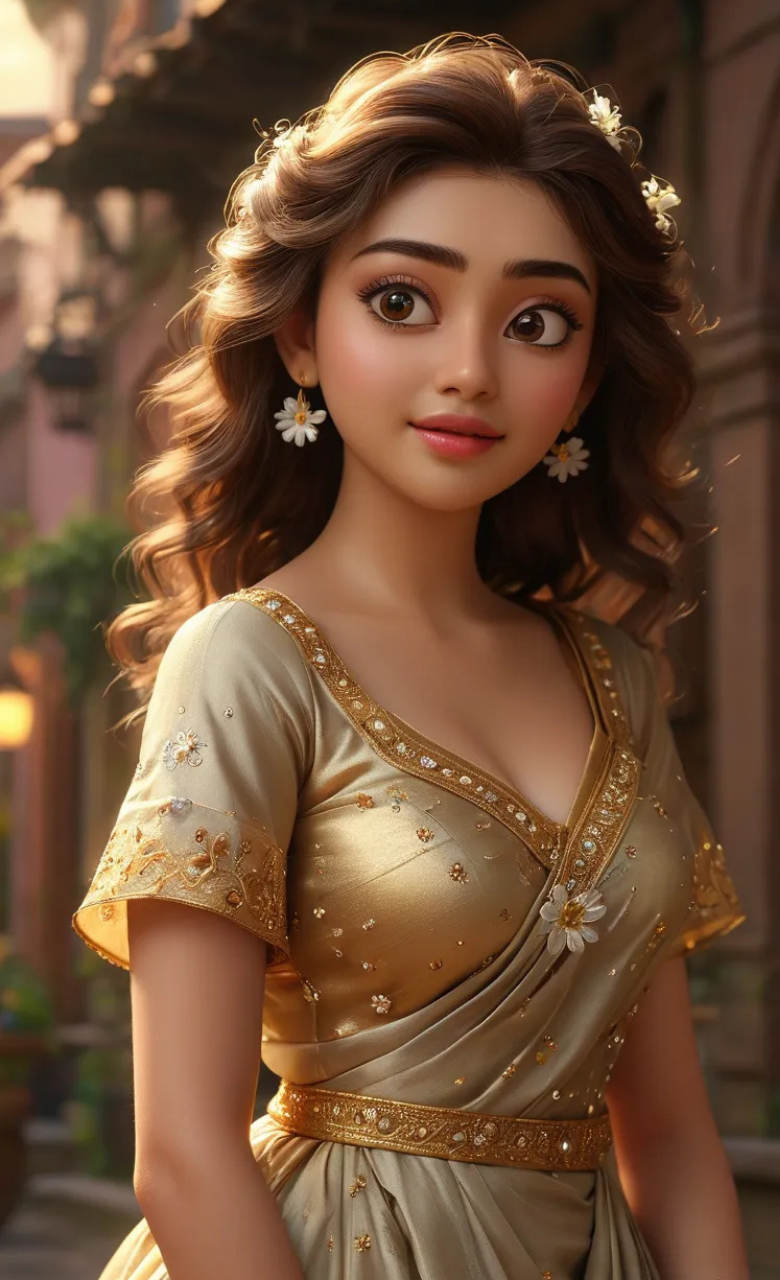 This enchanting 3D cartoon girl character is designed to captivate with her cultural elegance and charming personality. She is dressed in an ash-colored dress adorned with golden flower prints, complemented by a flowing, graceful silhouette. Her curly, open hair adds a lively, youthful touch, while her golden jewelry shines softly against the festive backdrop.