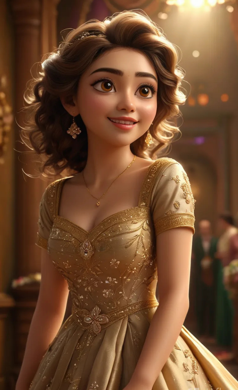 This 3D cartoon girl character radiates elegance and warmth in her ash and gold dress, adorned with delicate floral prints. Her short, curly hair frames her face beautifully, adding a youthful and playful touch to her appearance.