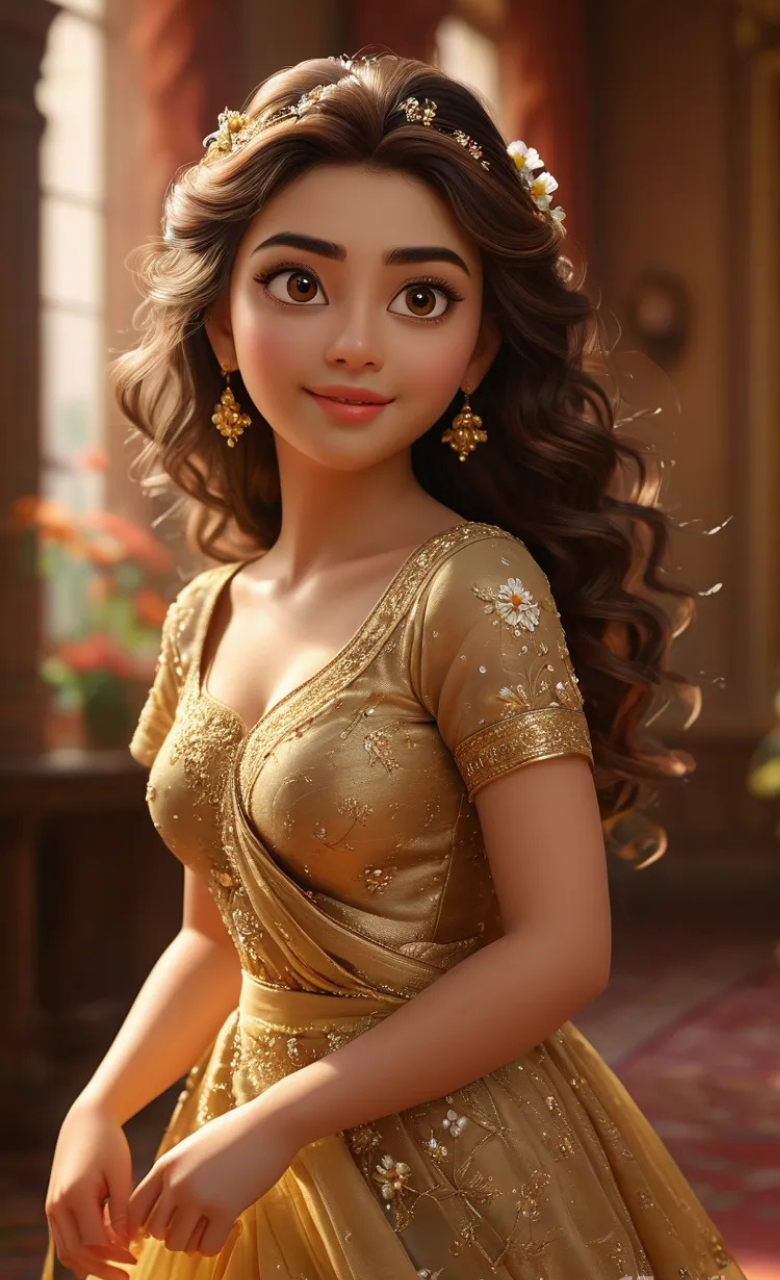 3D cartoon girl in an ash golden dress with flower prints, curly open hair with a flower, and golden jewelry, giving a sideward stare with a smile, standing in a hall.3D Cartoon Girl Image 52