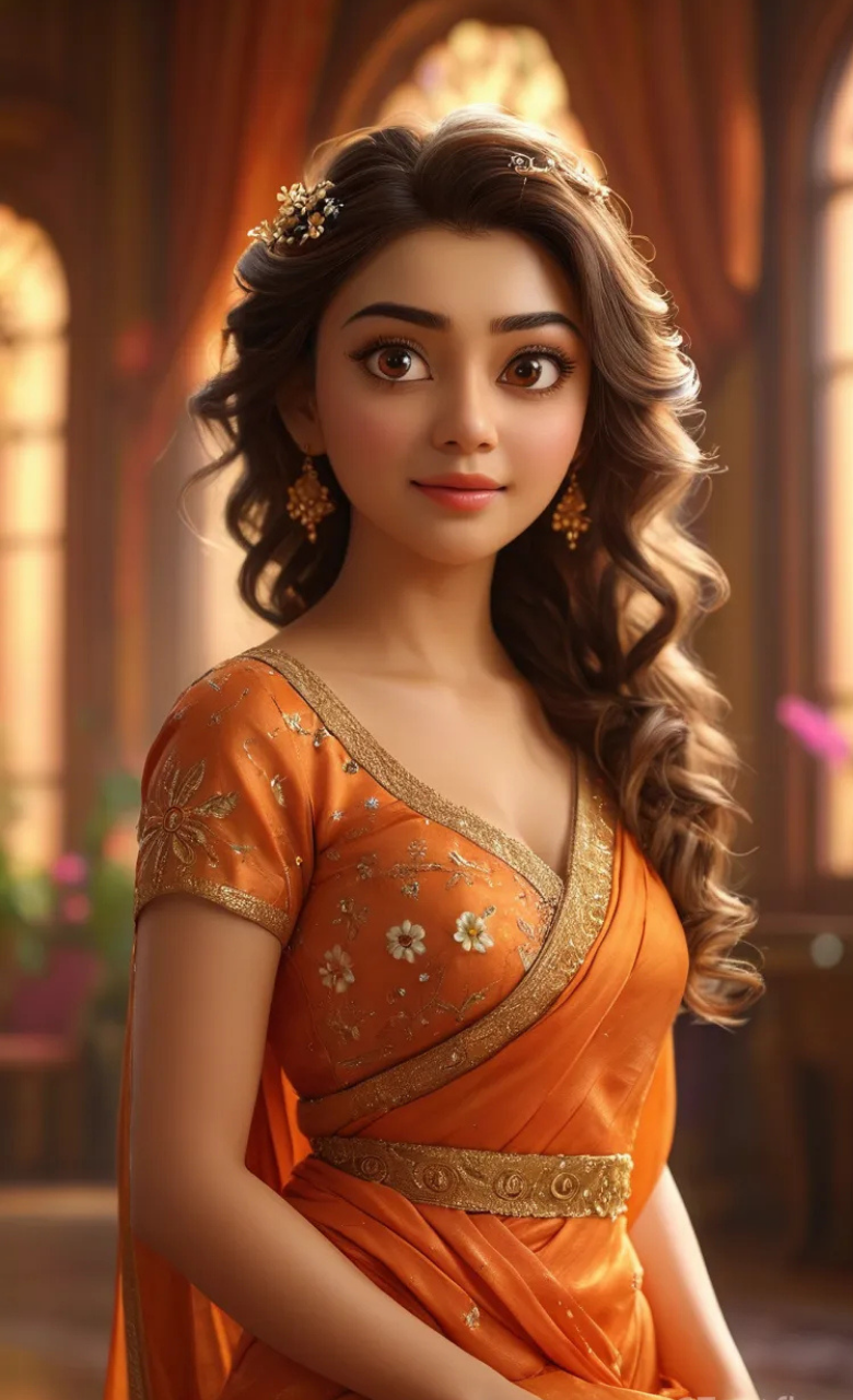 This captivating 3D cartoon girl character is dressed in a dark orange outfit adorned with a golden border and delicate flower prints. Her curly hair is beautifully styled and accented by a striking piece of head jewelry that adds a regal touch.