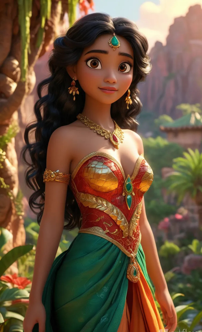 This eye-catching 3D cartoon girl image showcases a character dressed in traditional orange and green attire, paired with graceful long open hair and stunning golden jewelry. Her wide-open eyes reflect wonder as she observes the distant mountains, creating a serene and culturally rich visual. Ideal for digital storytelling, character design, cultural themes, or visual art projects.