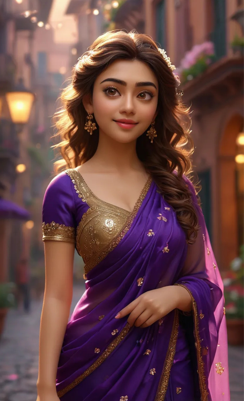 Celebrate tradition and beauty with this delightful 3D cartoon girl, designed in a dark violet saree adorned with golden flower prints and a shimmering gold border. Her curly, open hair and sweet smile bring her personality to life, while the vibrant festival street background adds warmth and celebration to the scene. Ideal for cultural, festive, or animated projects, she brings charm and authenticity to every visual story.