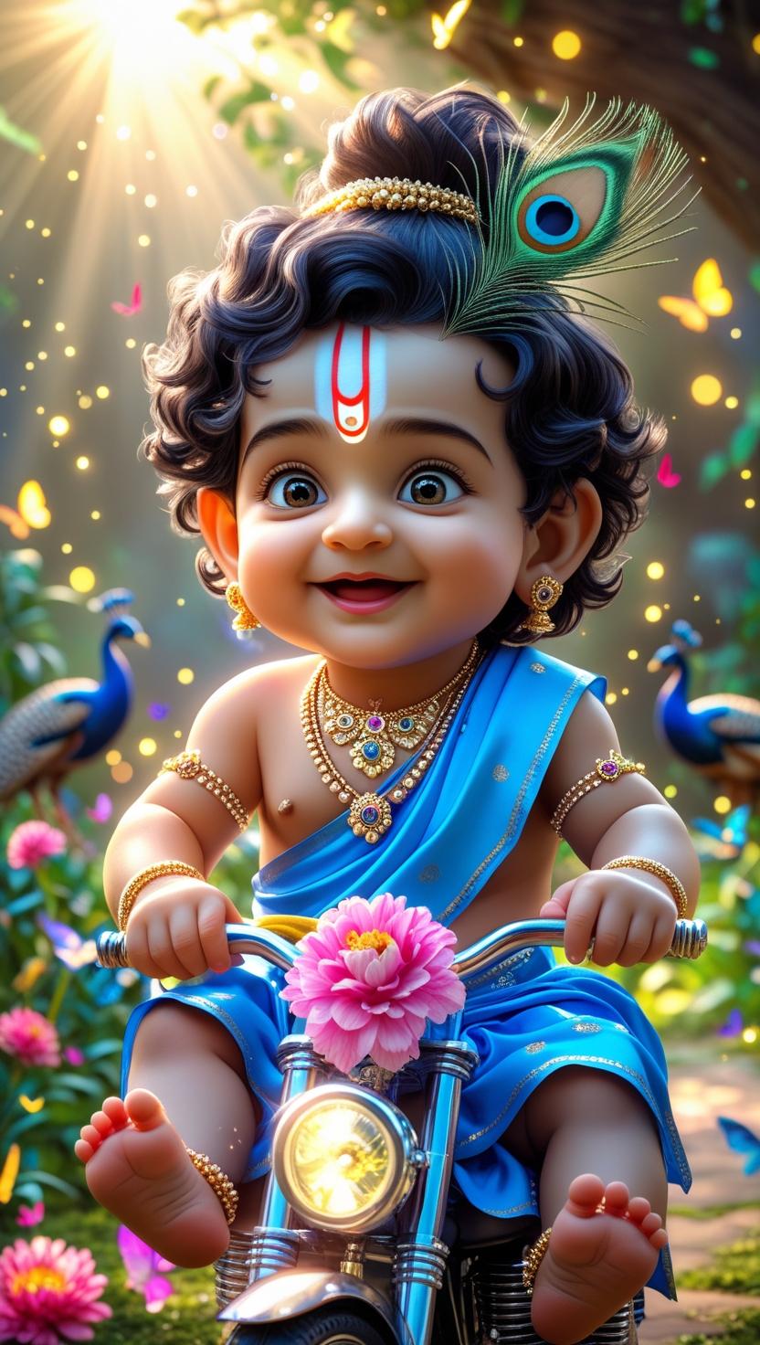 Add a touch of divine joy to your collection with this unique **3D cartoon Little Krishna** artwork. Krishna, dressed in an electric dark blue dhoti and sparkling golden jewellery, sits gracefully on a moped scooter adorned with vibrant flowers and green vines. His signature peacock feather crown enhances his divine charm, while the scooter setting adds a playful, festive twist. Perfect for devotional projects, cultural storytelling, festival promotions, children’s illustrations, and creative animations, this artwork beautifully balances tradition and modern style.